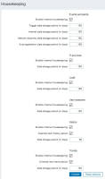 ### Option: HousekeepingFrequency # How often Zabbix will perform housekeeping procedure (in hours). # Housekeeping is removing outdated information from the database. # To prevent Housekeeper from being overloaded, no more than 4 times HousekeepingFrequency # hours of outdated information are deleted in one housekeeping cycle, for each item. # To lower load on server startup housekeeping is postponed for 30 minutes after server start. # With HousekeepingFrequency=0 the housekeeper can be only executed using the runtime control option. # In this case the period of outdated information deleted in one housekeeping cycle is 4 times the # period since the last housekeeping cycle, but not less than 4 hours and not greater than 4 days. # # Mandatory: no # Range: 0-24 # Default: # HousekeepingFrequency=1 ### Option: MaxHousekeeperDelete # The table "housekeeper" contains "tasks" for housekeeping procedure in the format: # [housekeeperid], [tablename], [field], [value]. # No more than 'MaxHousekeeperDelete' rows (corresponding to [tablename], [field], [value]) # will be deleted per one task in one housekeeping cycle. # SQLite3 does not use this parameter, deletes all corresponding rows without a limit. # If set to 0 then no limit is used at all. In this case you must know what you are doing! # # Mandatory: no # Range: 0-1000000 # Default: # MaxHousekeeperDelete=5000