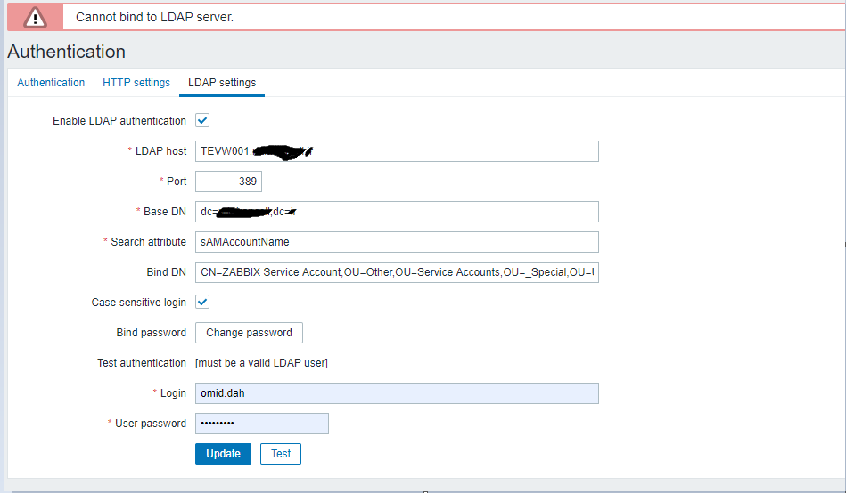 ZABBIX authentication for LDAP is came cross issue:"Cannot bind to LDAP server."