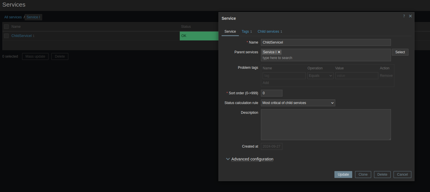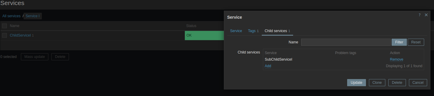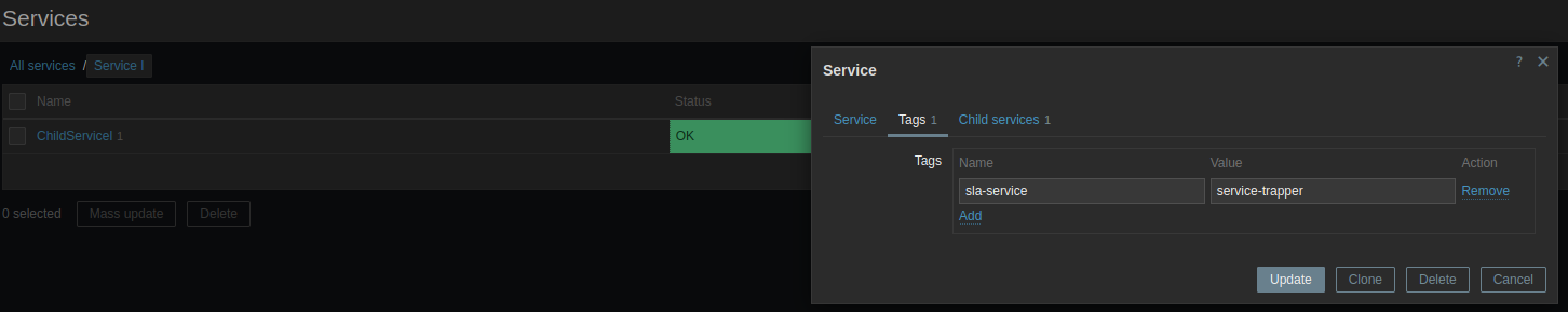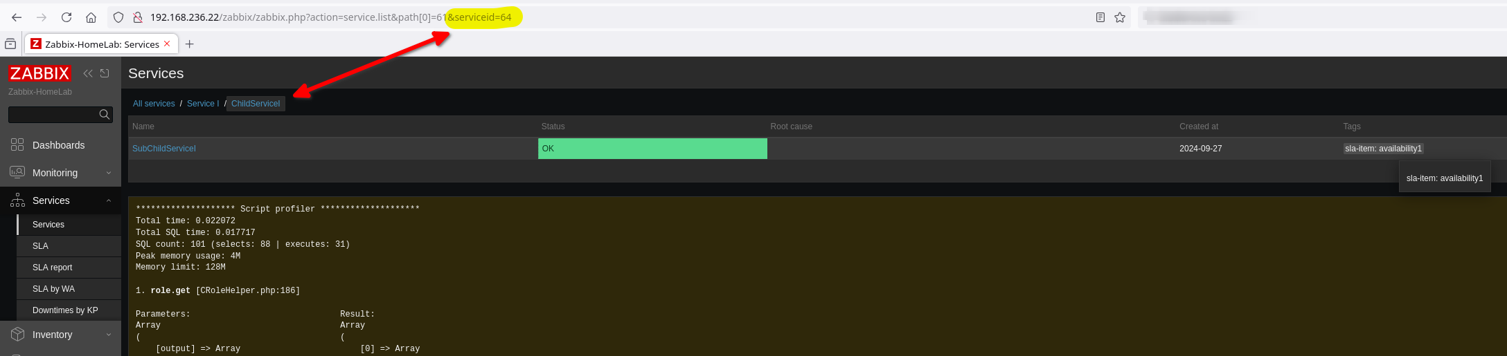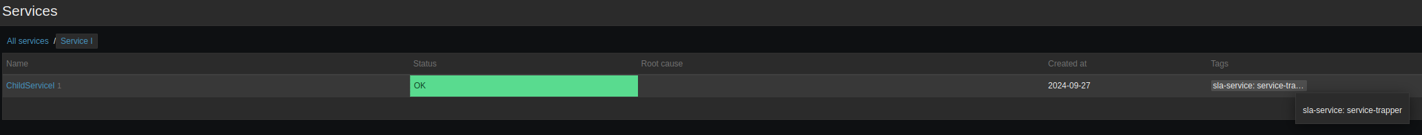 - ServiceI [level 0](service id 101) -> ChildServiceI [level 1] (service id 332)(tags: sla-service:service-trapper) -> SubChildServiceI [level 2] (tags: sla-item:availability1, host:host1)