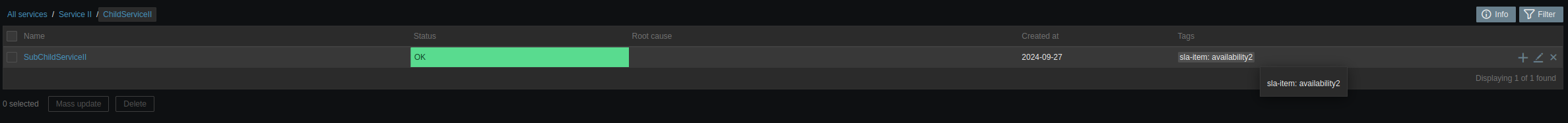 - ServiceII [level 0](service id 102) -> ChildServiceII [level 1] (service id 334)(tags: sla-service:service-trapper) -> SubChildServiceII [level 2] (tags: sla-item:-availability2, host:host1)