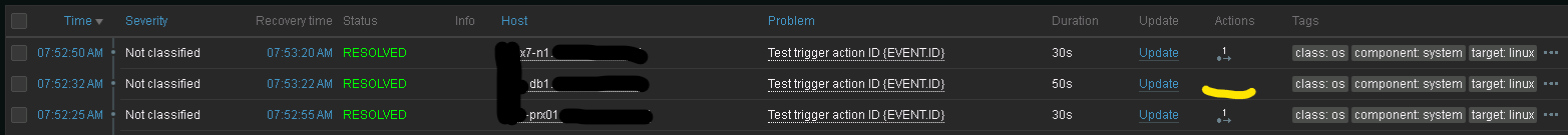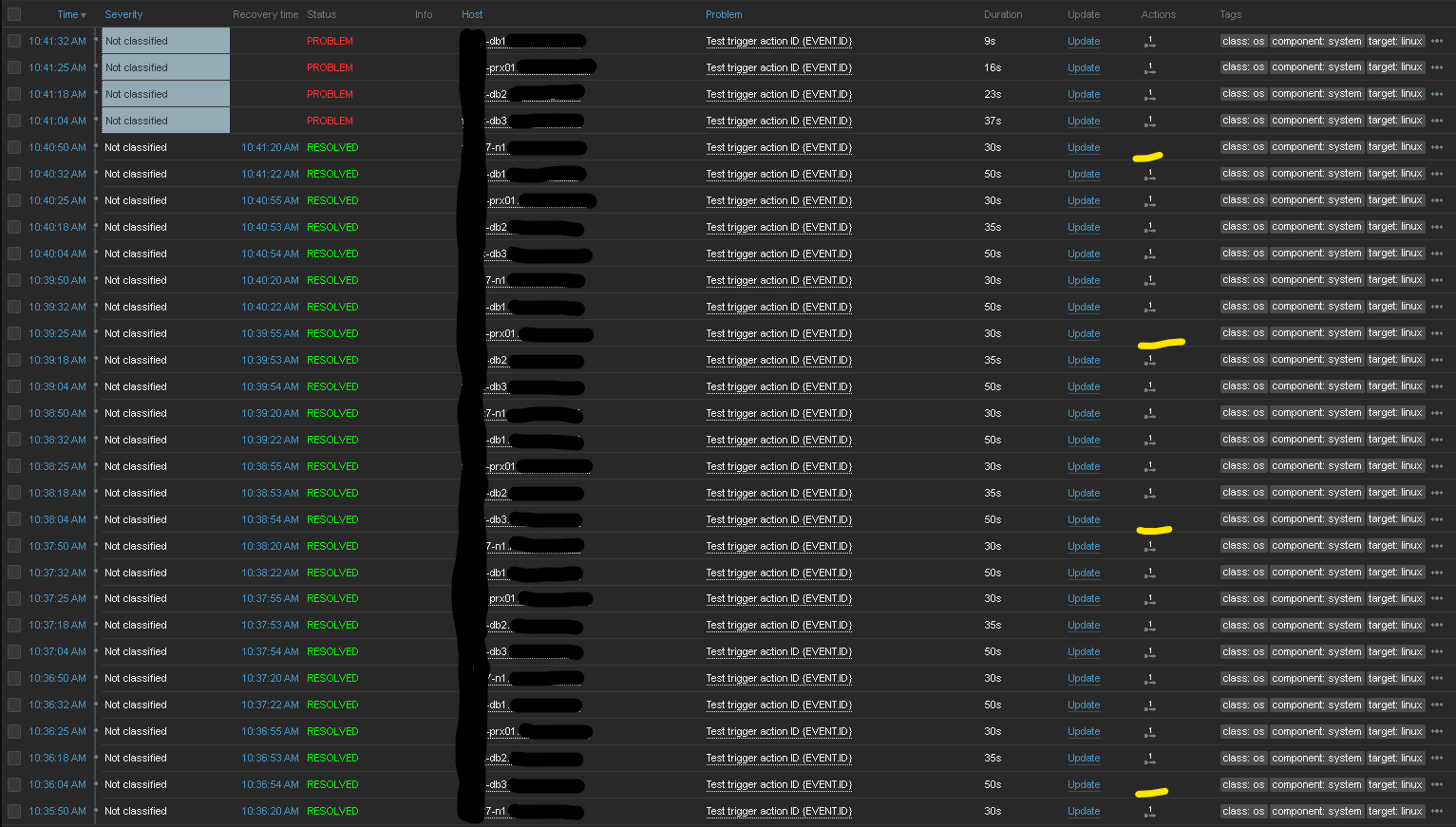 - Configure a trigger action that will immediatelly run a shell script (via Media Type, with no concurrent sessions) on an event/problem creation or resolution if some tag either exists or does not exist with a certain value