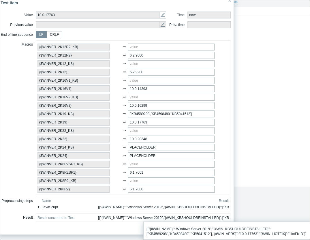 Now we have an depending item, that will check, if the hotfixes (that should be installed) are also installed. This hotfix-numbers should be stored in the LLD macro {#WIN_KBSHOULDBEINSTALLED}. This macro is used in the preprocessing javascript code.