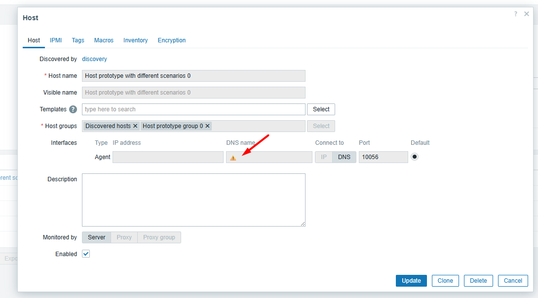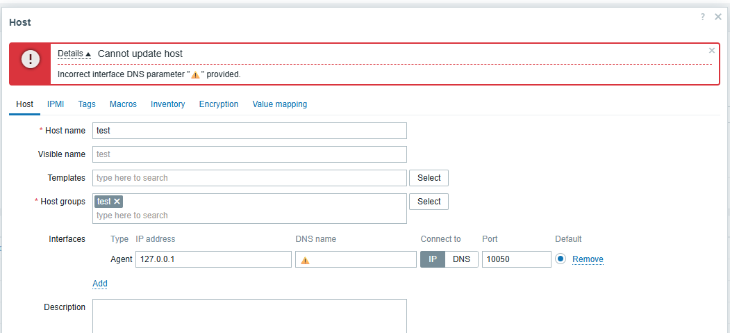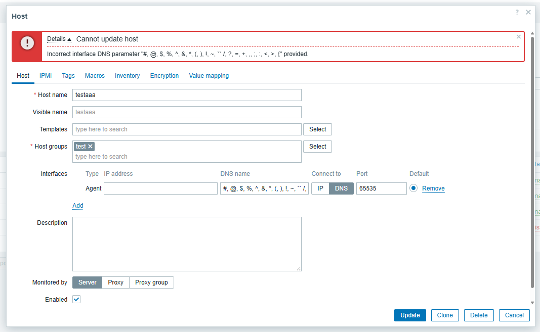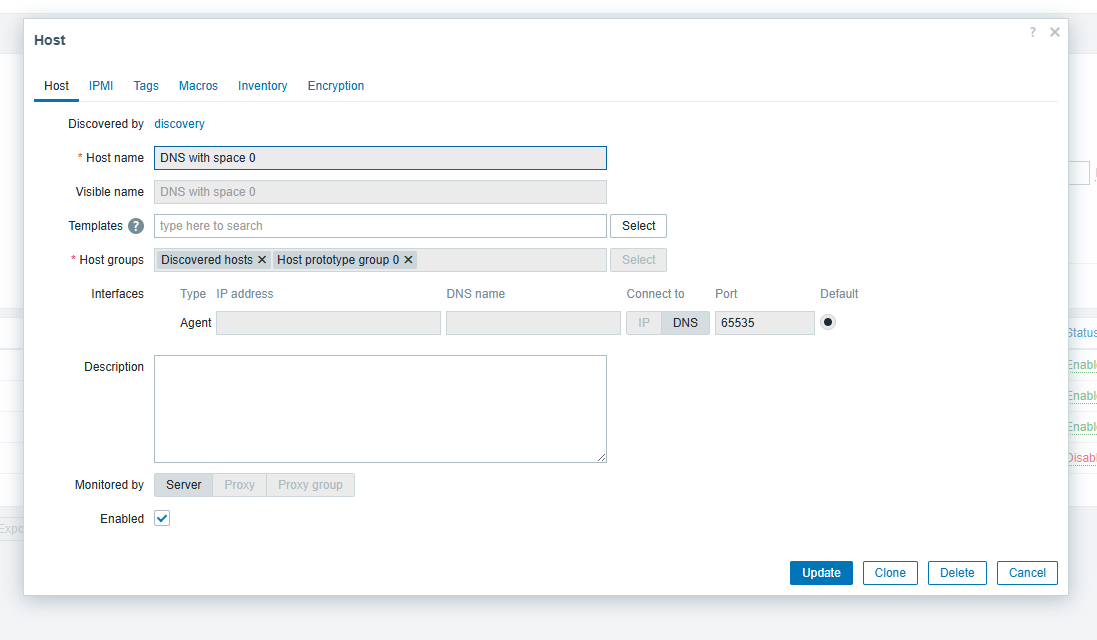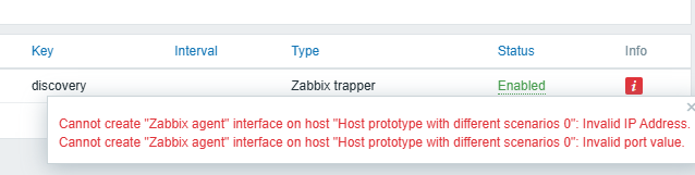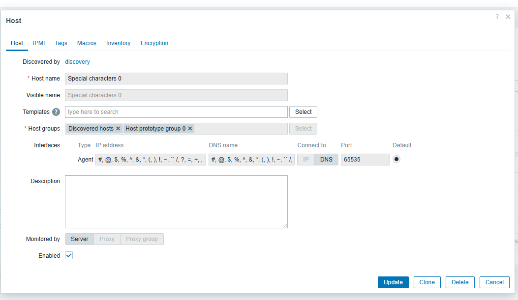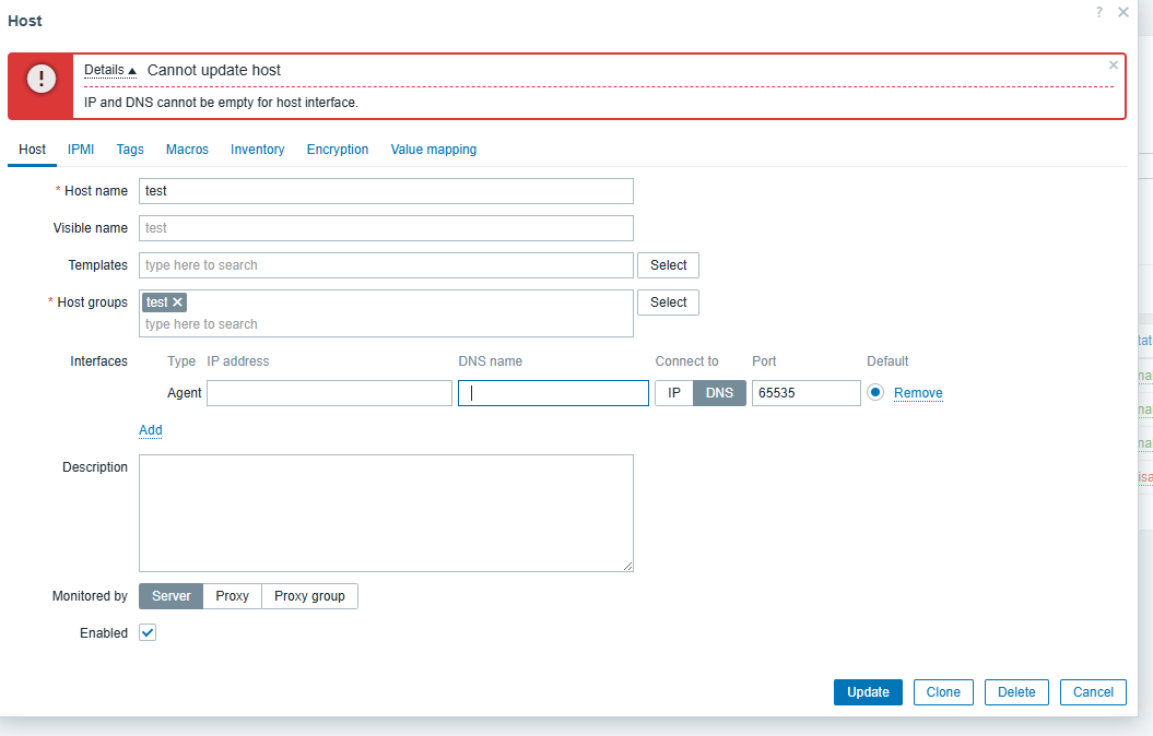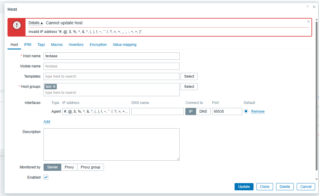 Not running VMs won't get assigned an IP in the Interfaces/Agent field. When you then want to disable those non running hosts zabbix throws an error 'IP address: This field cannot be empty'
