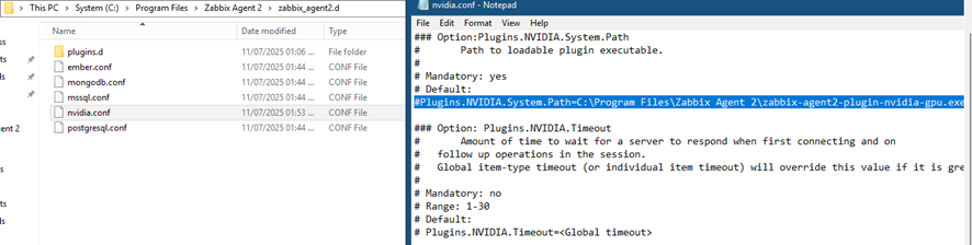 Para esto tendremos que ir a la siguiente ruta C:\Program Files\Zabbix Agent 2\zabbix_agent2.d, abrir con un editor el archivo de configuración y comentar la siguiente línea hashtag#Plugins.NVIDIA.System.Path=C:\Program Files\Zabbix Agent 2\zabbix-agent2-plugin-nvidia-gpu.exe