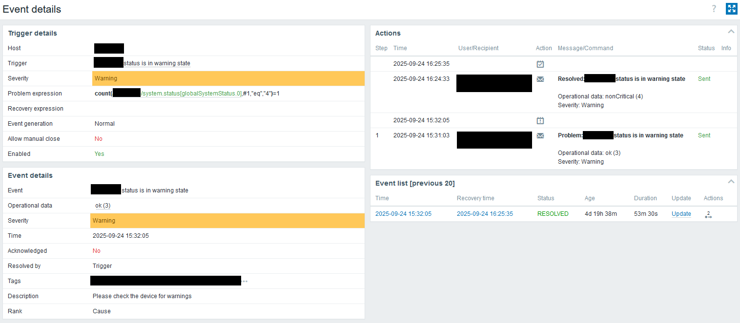 - Trigger configured like this: count(/hostname/system.status[globalSystemStatus.0],#1,"eq","{$HEALTH_WARN_STATUS}")=1