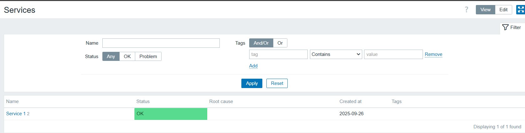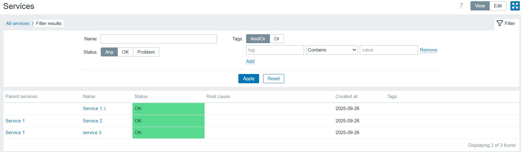 When I press “Reset”, I get the original view with the parent service visible.
