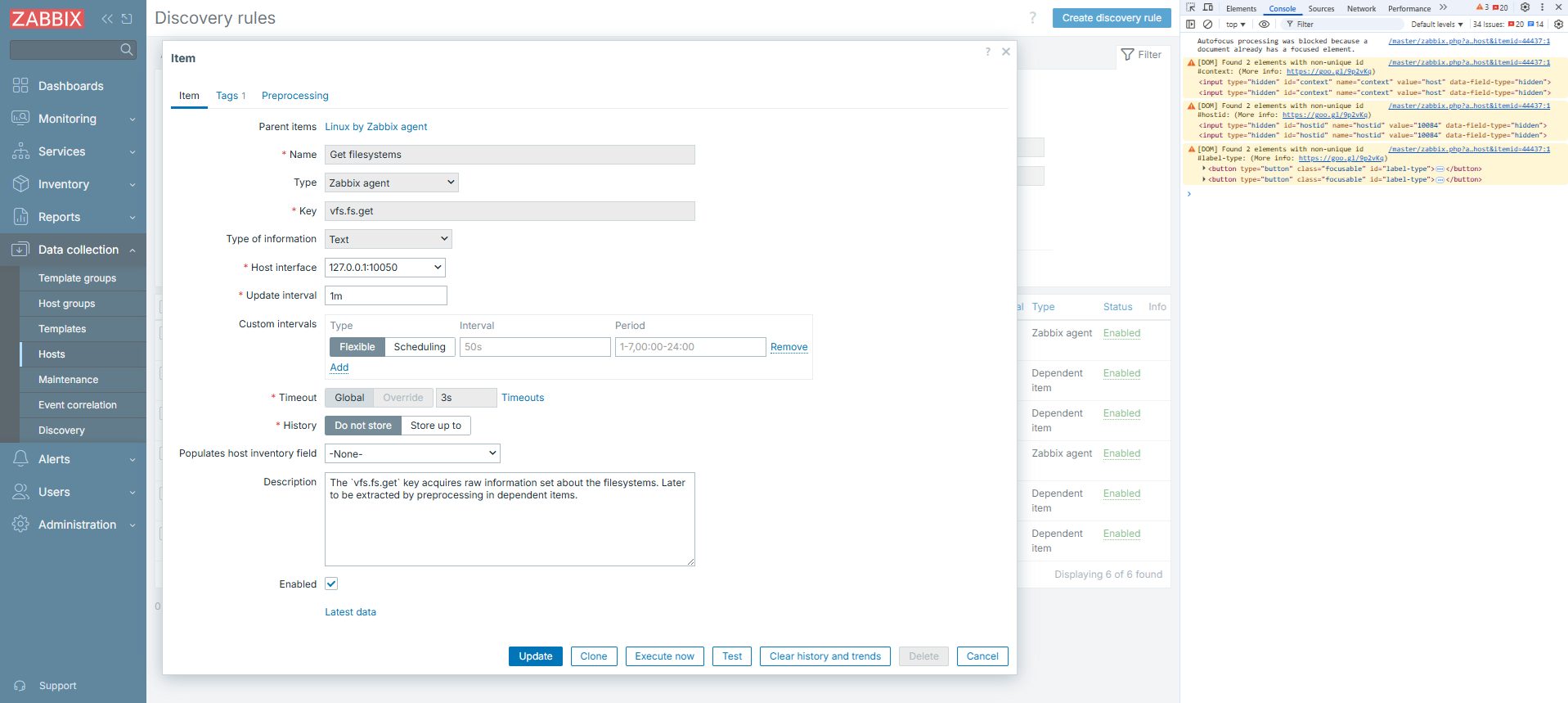 - Find a Discovery rule that has a master item (example: Linux by Zabbix agent: Get filesystems: Mounted filesystem discovery).