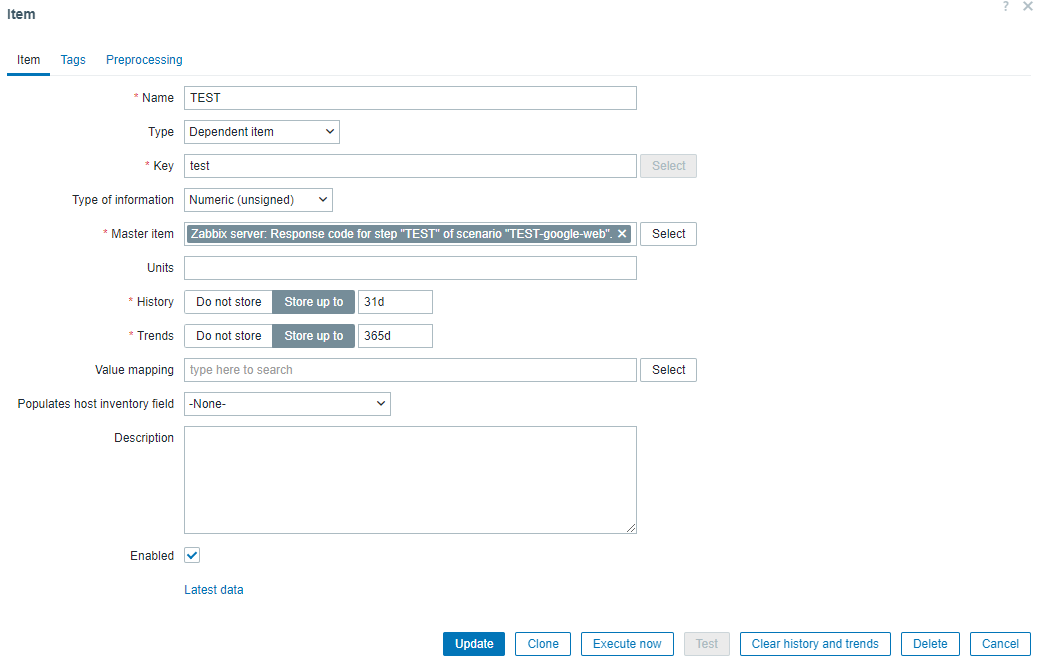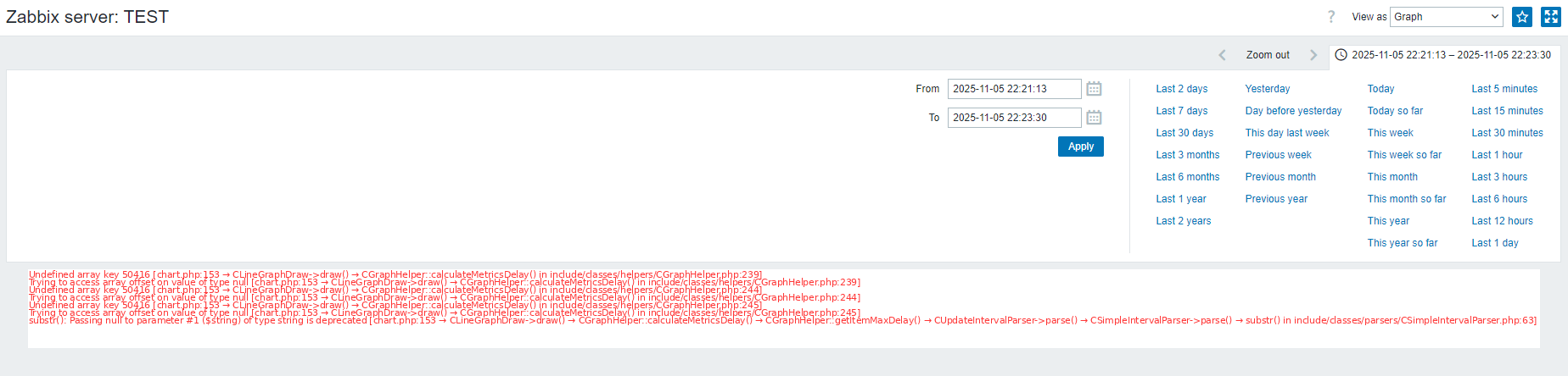 When trying to open the Graph view for a Dependent item created from a Web scenario master item, the graph page fails to render and displays multiple PHP warnings.