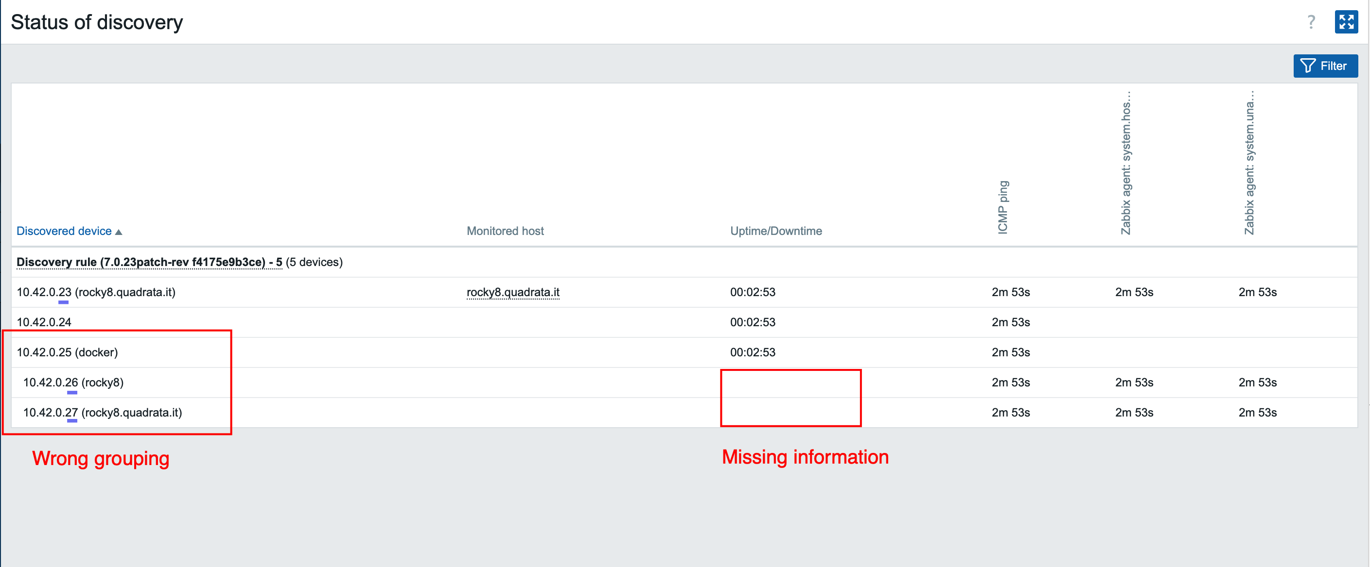 - the first IP is marked as not discovered anymore (with red background, which is WRONG)