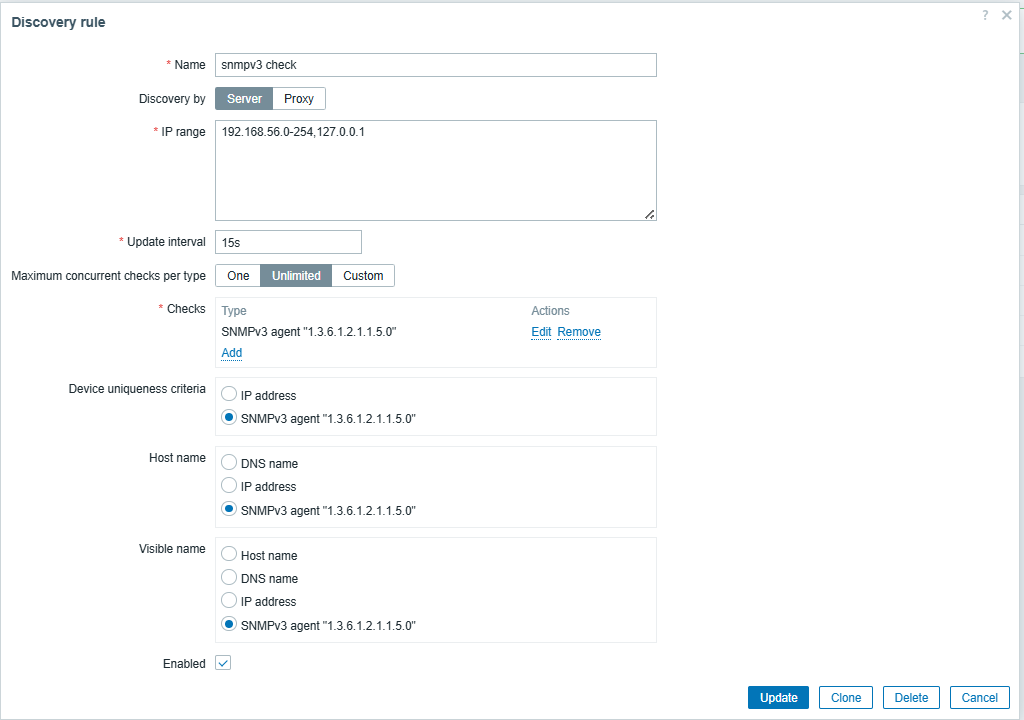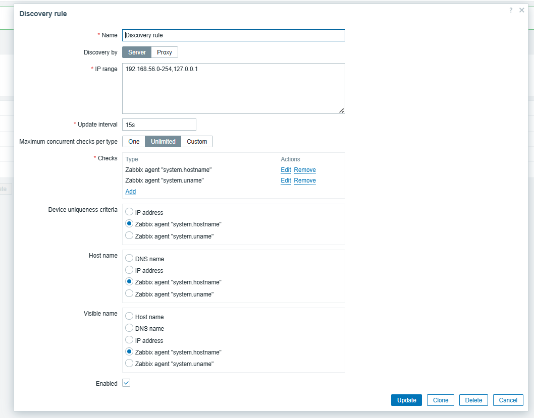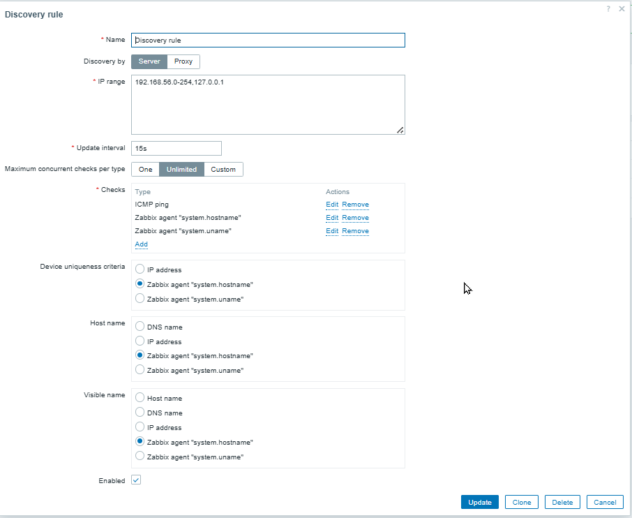 - Configure a Network discovery rule with two agent checks: Â system.hostname and system.uname. Set scan update interval to 2m. Set Device unique criteria to "system.hostname"