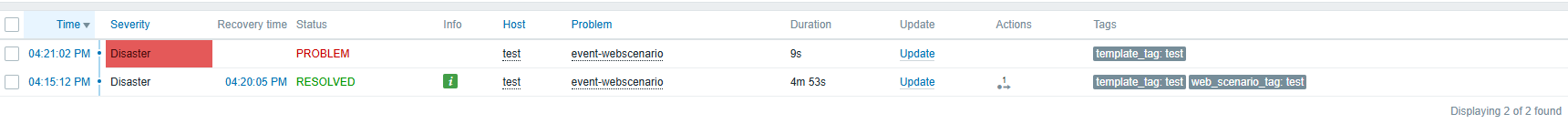 - Newly created web scenarios in the same template (created directly under Zabbix 7) work correctly — their triggers properly inherit tags from the parent template.