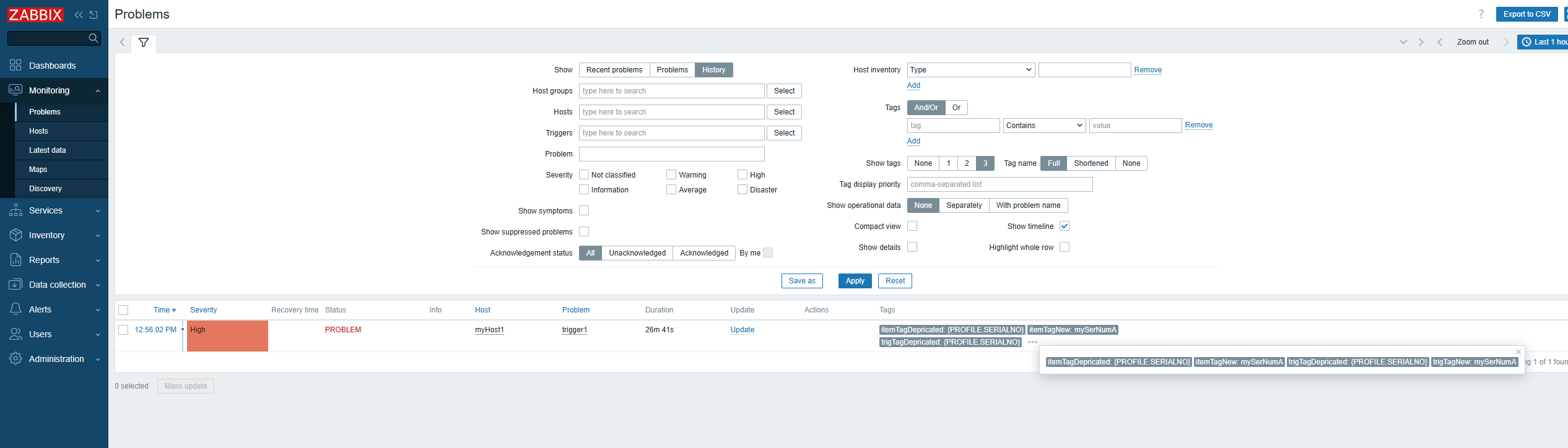 7. Find the high severity problem of this host, observe the tags - the item and trigger tags with non-deprecated macro tag values are resolved, but the deprecated ones are not resolved