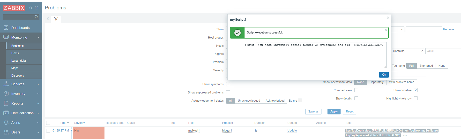8. Click on the host name myHost1, in section Scripts click on myScript1, observe in the result - the non-deprecated macro value is resolved, but the deprecated one is not resolved