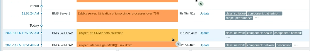 All Juniper switches have been successfully onboarded into Zabbix. However, the devices are not displaying current problems; instead, the dashboard shows issues dated 10 to 15 days ago. Kindly advise on how to resolve this discrepancy