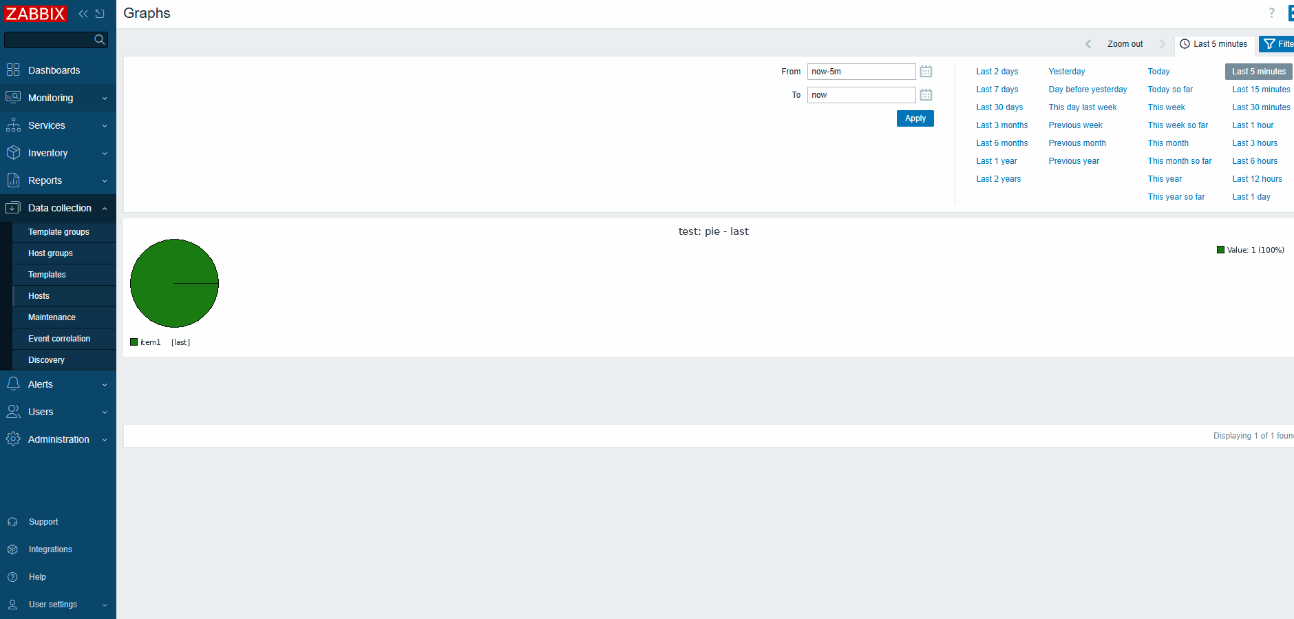 3. Open Monitoring -> Hosts -> test -> graphs, validate that pie graph with function last is displayed