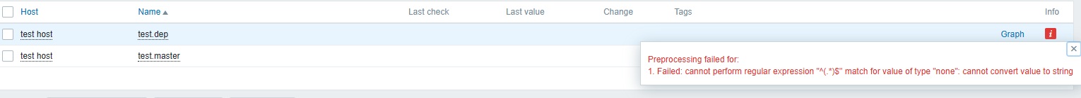 Instead, when the master’s value is discarded, the dependent item should not be processed at all (or at least should not get a none value that causes a regex error). This behavior appears only in 7.0.22; in 7.0.0–7.0.21 the same configuration works without errors.