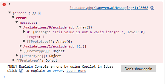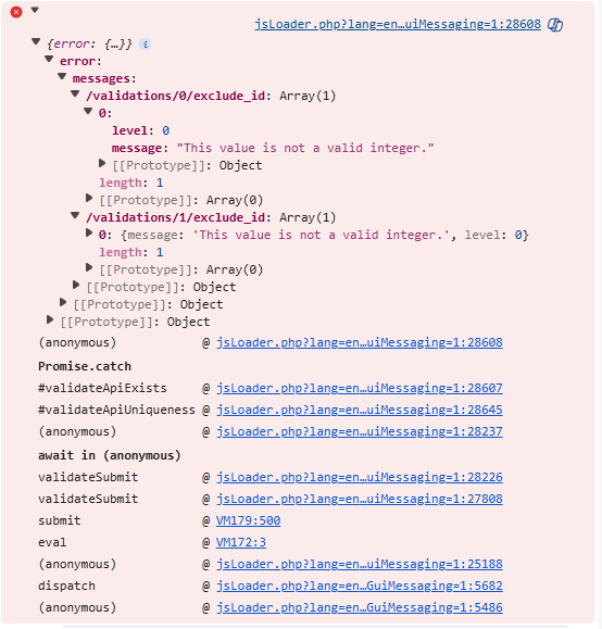 {"error":{"messages":{"\/validations\/0\/exclude_id":[{"message":"This value is not a valid integer.","level":0}],"\/validations\/1\/exclude_id":[{"message":"This value is not a valid integer.","level":0}],"\/validations\/2\/exclude_id":[{"message":"This value is not a valid integer.","level":0}]}}}