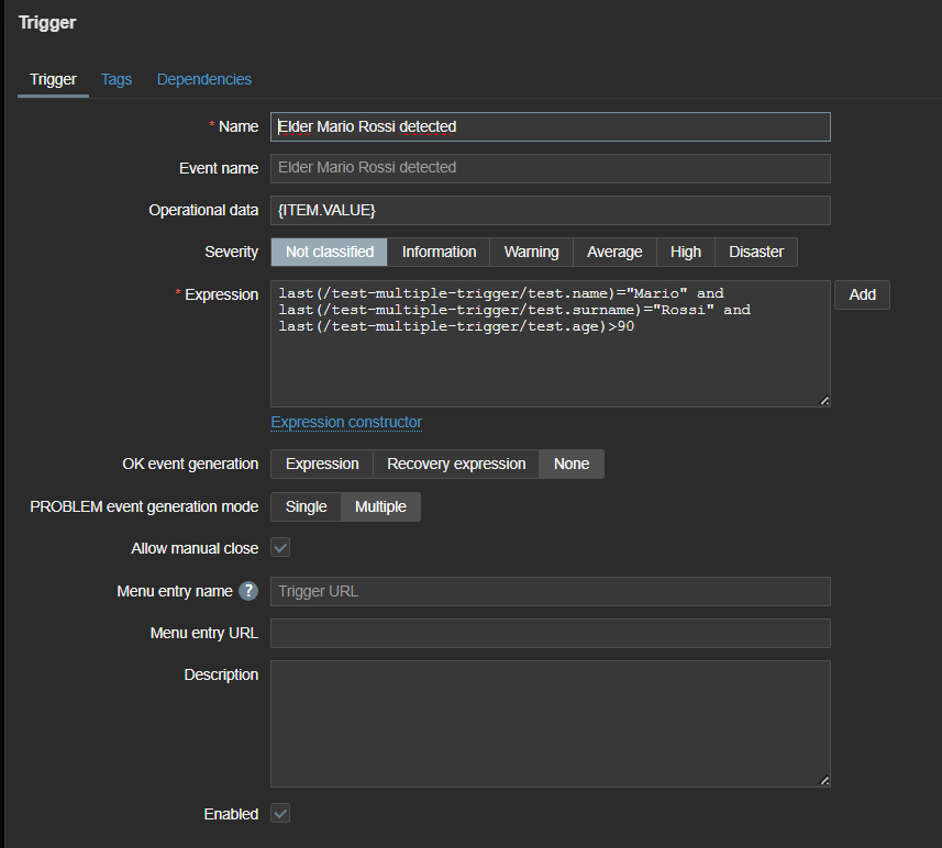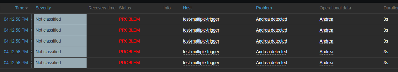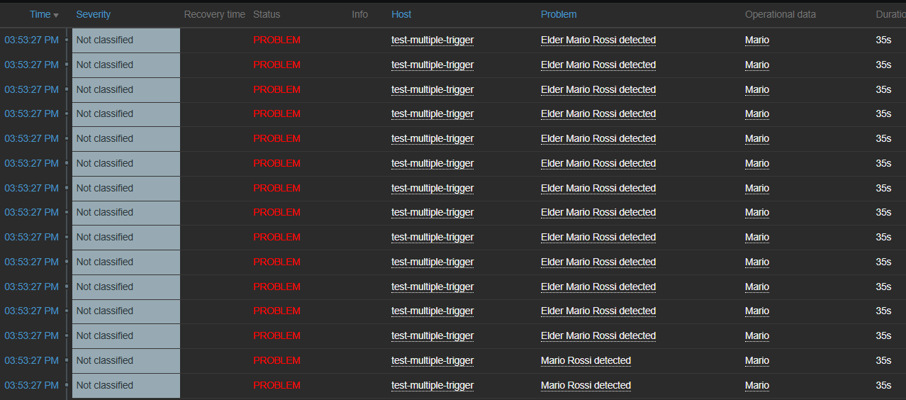 for i in {1..5}; do zabbix_sender -v -z 127.0.0.1 -p 10051 -s test-multiple-trigger -k test.master.json -o '[{"name": "Mario","surname":"Rossi","age":100}]'; done for i in {1..5}; do zabbix_sender -v -z 127.0.0.1 -p 10051 -s test-multiple-trigger -k test.master.json -o '[{"name": "Andrea","surname":"Bianchi","age":30}]'; done