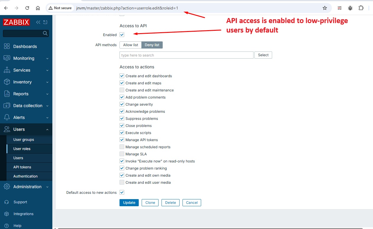 Starting with Zabbix 8.0 disable API access to the regular User role by default.