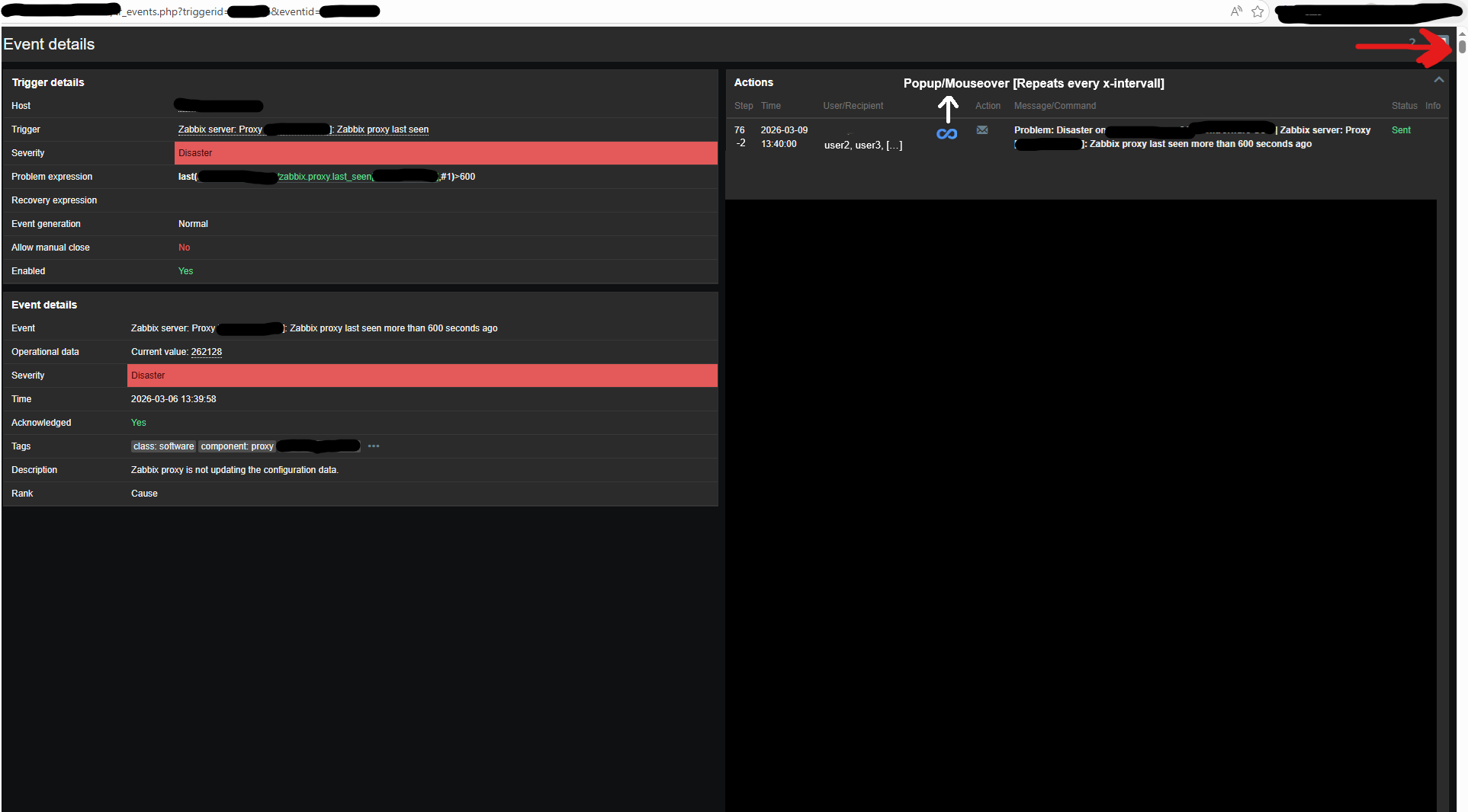 Right now Zabbix sends a message to three recipients so for every user it generates this detailed action step not only in the action log, but also in the Actions section under Event Details. The message is exactly equal for all users.