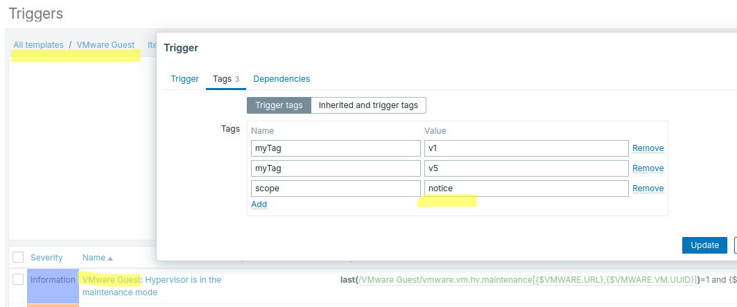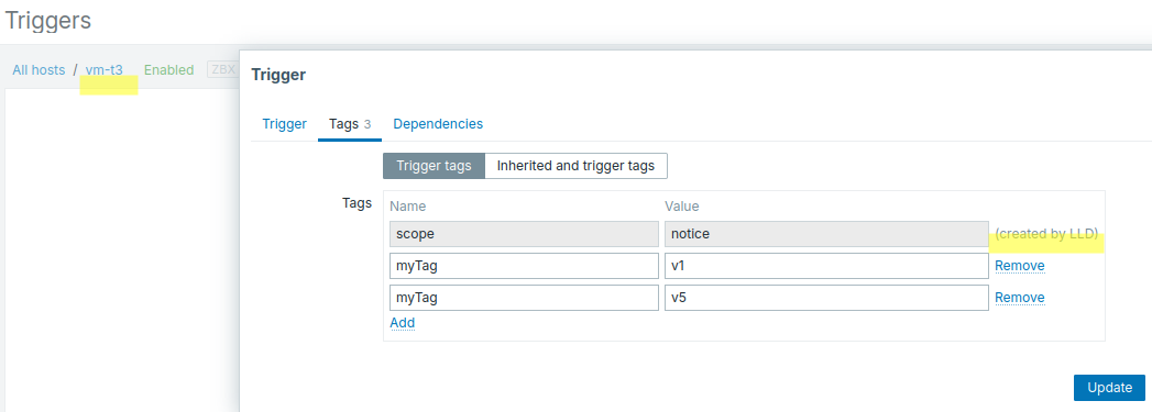 All Triggers that are created from LLD discovered items are set so that Tags cannot be added or changed on the triggers.
