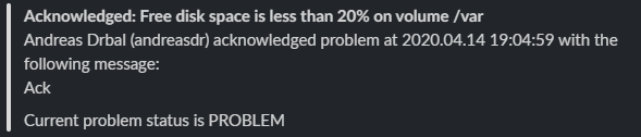 Hello Andrei, The user that acknowledged it was myself in the frontend. I have super admin privileges on the Zabbix environment. The process of acknowledging the event starts by selecting the hyperlink from the Slack message: