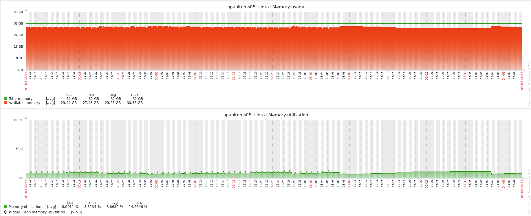 2 days after cache reload: ps -eo size,pid,user,command --sort -size | awk '{ hr=$1/1024 ; printf("%13.2f Mb ",hr) } { for ( x=4 ; x<=NF ; x++ ) { printf("%s ",$x) } print "" }' | cut -d "" -f2 | cut -d "-" -f1 0.00 Mb COMMAND 4868.86 Mb /usr/sbin/mariadbd 231.28 Mb /usr/sbin/zabbix_agent2 870.21 Mb /usr/sbin/zabbix_proxy: snmp poller #4 [got 230 values, queued 115 in 5 sec] 827.39 Mb /usr/sbin/zabbix_proxy: snmp poller #2 [got 924 values, queued 793 in 5 sec] 806.59 Mb /usr/sbin/zabbix_proxy: snmp poller #9 [got 0 values, queued 0 in 5 sec] 322.96 Mb falcon 619.44 Mb /usr/sbin/zabbix_proxy: snmp poller #5 [got 0 values, queued 0 in 5 sec] 610.13 Mb /usr/sbin/zabbix_proxy: snmp poller #1 [got 682 values, queued 744 in 5 sec] 565.50 Mb /usr/sbin/zabbix_proxy: snmp poller #3 [got 0 values, queued 0 in 5 sec] 471.94 Mb /usr/sbin/zabbix_proxy: snmp poller #6 [got 68 values, queued 339 in 5 sec] 43.29 Mb /usr/sbin/zabbix_proxy: discovery manager #1 [processing 0 rules, 0 unsaved checks] 120.49 Mb /usr/sbin/zabbix_proxy: http agent poller #1 [got 4 values, queued 5 in 5 sec] 91.95 Mb /usr/sbin/zabbix_proxy: http agent poller #2 [got 0 values, queued 0 in 5 sec] 169.61 Mb /usr/sbin/zabbix_proxy: preprocessing manager #1 [queued 1136, processed 1216 values, idle 4.934276 sec during 5.007030 sec] 252.95 Mb /usr/sbin/zabbix_proxy: snmp poller #8 [got 0 values, queued 0 in 5 sec] 228.77 Mb /usr/sbin/zabbix_proxy: snmp poller #7 [got 322 values, queued 491 in 5 sec] 82.56 Mb /usr/sbin/zabbix_proxy: http agent poller #3 [got 0 values, queued 0 in 5 sec] 194.55 Mb /usr/sbin/zabbix_proxy: snmp poller #10 [got 134 values, queued 153 in 5 sec] 65.75 Mb /usr/sbin/zabbix_proxy: agent poller #1 [got 1 values, queued 1 in 5 sec] 65.75 Mb /usr/sbin/zabbix_proxy: agent poller #2 [got 0 values, queued 0 in 5 sec] 65.35 Mb /usr/sbin/zabbix_proxy: agent poller #3 [got 0 values, queued 0 in 5 sec] 54.30 Mb /usr/sbin/zabbix_proxy: configuration syncer [synced config 2 bytes in 0.207794 sec, idle 10 sec] 32.16 Mb /usr/sbin/zabbix_proxy: data sender [sent 906 values in 0.048013 sec, idle 1 sec] 17.50 Mb /usr/sbin/zabbix_proxy: history syncer #1 [processed 3 values in 0.000309 sec, idle 1 sec] 9.38 Mb /usr/sbin/zabbix_proxy: icmp pinger #3 [got 0 values in 0.000027 sec, idle 1 sec] 9.38 Mb /usr/sbin/zabbix_proxy: icmp pinger #40 [got 0 values in 0.000051 sec, idle 1 sec] 9.37 Mb /usr/sbin/zabbix_proxy: icmp pinger #11 [got 0 values in 0.000131 sec, idle 1 sec] 9.36 Mb /usr/sbin/zabbix_proxy: icmp pinger #4 [got 0 values in 0.000030 sec, idle 1 sec] 9.36 Mb /usr/sbin/zabbix_proxy: icmp pinger #17 [got 0 values in 0.000026 sec, idle 1 sec] 9.34 Mb /usr/sbin/zabbix_proxy: icmp pinger #18 [got 0 values in 0.000055 sec, idle 1 sec] 9.34 Mb /usr/sbin/zabbix_proxy: icmp pinger #42 [got 0 values in 0.000057 sec, idle 1 sec] 9.33 Mb /usr/sbin/zabbix_proxy: icmp pinger #25 [got 0 values in 0.000039 sec, idle 1 sec] |
