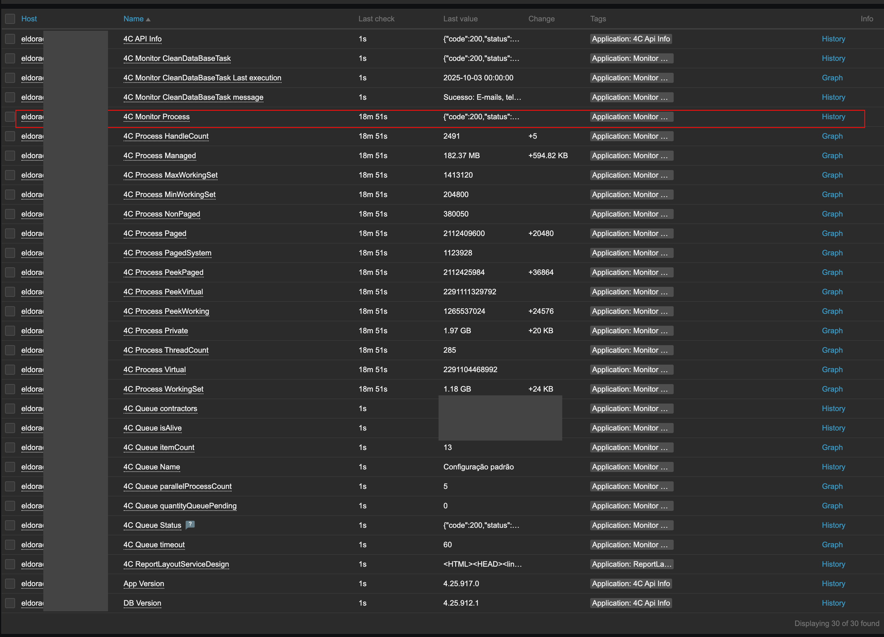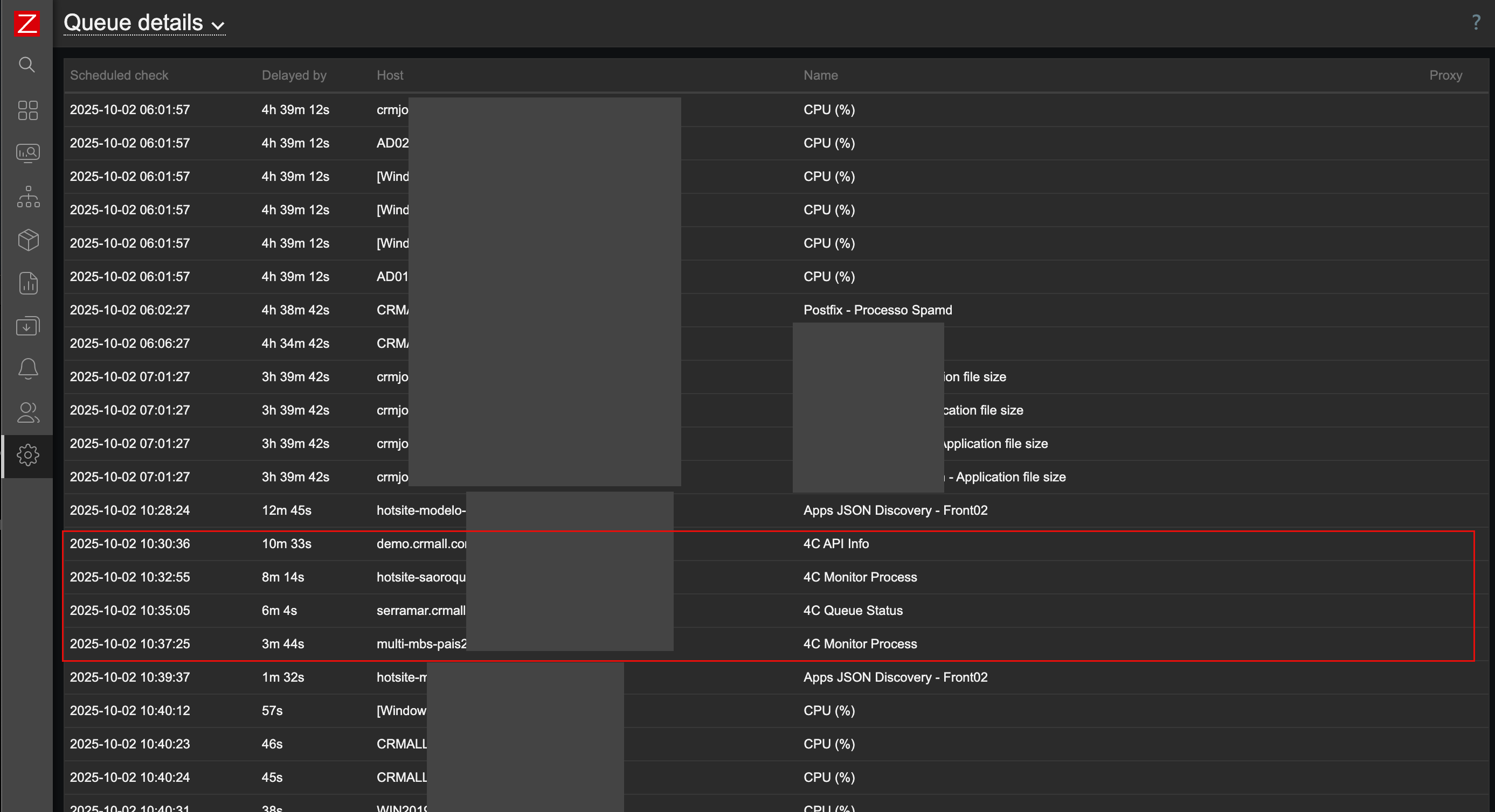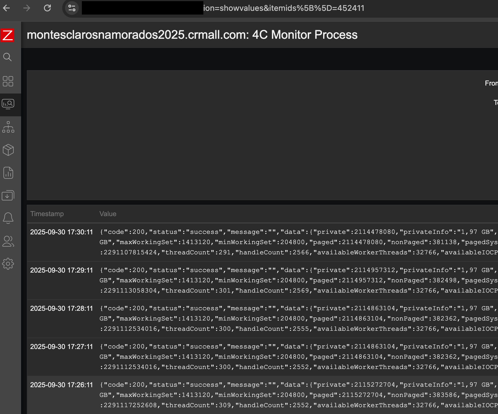 Then, it stops showing in the logs, and the item gets stuck in the queue. I've downgraded until Zabbix 7.0.7, and the same happens. Now it's back on 7.0.18. These are the web server logs for the three requests mentioned above: 2025-10-01 11:34:19 10.5.11.206 GET /api/monitor/process - 443 - my-zabbix-server-ip - - 200 0 0 16 2025-10-01 11:35:19 10.5.11.206 GET /api/monitor/process - 443 - my-zabbix-server-ip - - 200 0 0 16 2025-10-01 11:36:20 10.5.11.206 GET /api/monitor/process - 443 - my-zabbix-server-ip - - 200 0 0 50 |