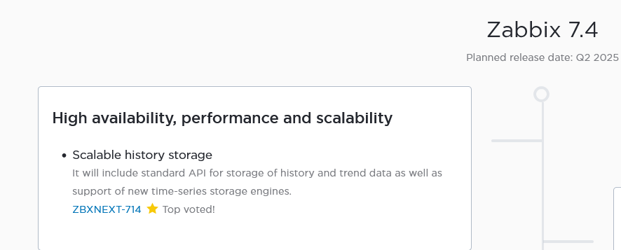 So, ClickHouse seems to be one of your choices: https://git.zabbix.com/projects/ZBX/repos/zabbix/compare/diff?sourceBranch=refs%2Fheads%2Ffeature%2FDEV-4427-7.5&targetRepoId=152 |